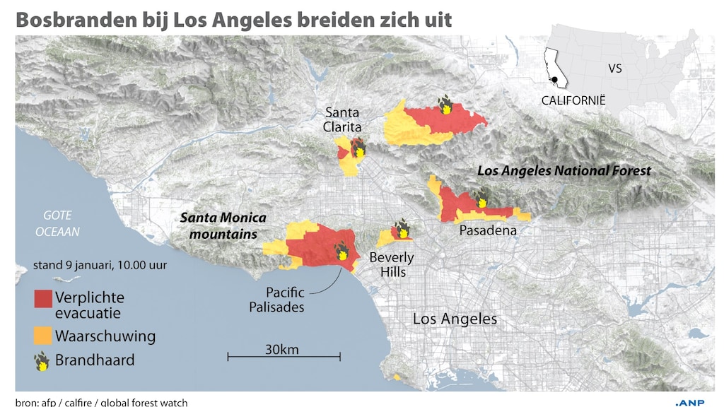 Gisteravond bereikte het vuur ook de Hollywood Hills, een van de meest iconische plekken van Los Angeles. Die is vrijwel onder controle. Volgens de politie is de brand in omvang afgenomen en woedt deze alleen nog op een klein stuk land in de heuvels. De brandweer heeft daar het vuur ingeperkt zodat het niet verder uitbreidt.